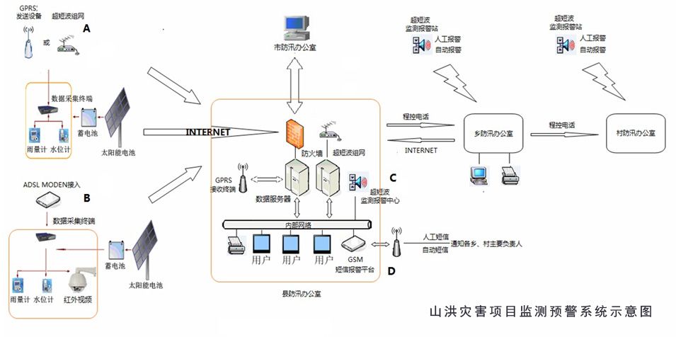 基于山(shān)洪災害的(de)流域面積小(x₽©σiǎo)、彙流時(shí)間(jiān)短(duǎn)、暴雨(yǔ)易引起山('≥$shān)洪暴漲而造成泥石流、崩塌、山(shān)體(tǐ) ®滑坡等地(dì)質災害的(de)特點,充分(fēn)利用(y←&Ωòng)傳感器(qì)與數(shù)據采集技(jì↕≤α)術(shù)、信息管理(lǐ)技(jì)術(shù)、★&通(tōng)訊技(jì)術(shù)、空(kōng)間(∑≠✔↑jiān)分(fēn)析技(jì)術(shù)、遙¶γ♥感技(jì)術(shù)等構建山(shān)洪災害監測預警系♥"§統, 實現(xiàn)雨(yǔ)水(sφΩhuǐ)情信息采集、統計(jì)分(fēn)析、數(shù)據管理(lǐ)•≈•、山(shān)洪預測、預報(bào)、預警等功能(néng),盡最←±✔★大(dà)可(kě)能(néng)減少(shǎo)山(shān)洪災害對(duì)人(r÷€♣★én)民(mín)生(shēng)命财産造成的(de)威脅、傷害。